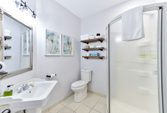 The en-suite bathroom offers a one-person shower and bath amenities, bringing a spa-like touch to your stay.